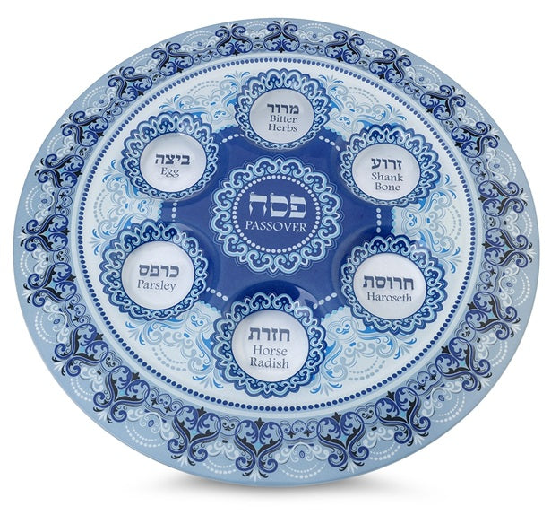 What a beautiful, large and colorful addition to your Passover table.  This plate has several shades of Blue, White and Gray with Black traditional Hebrew words for the elements.