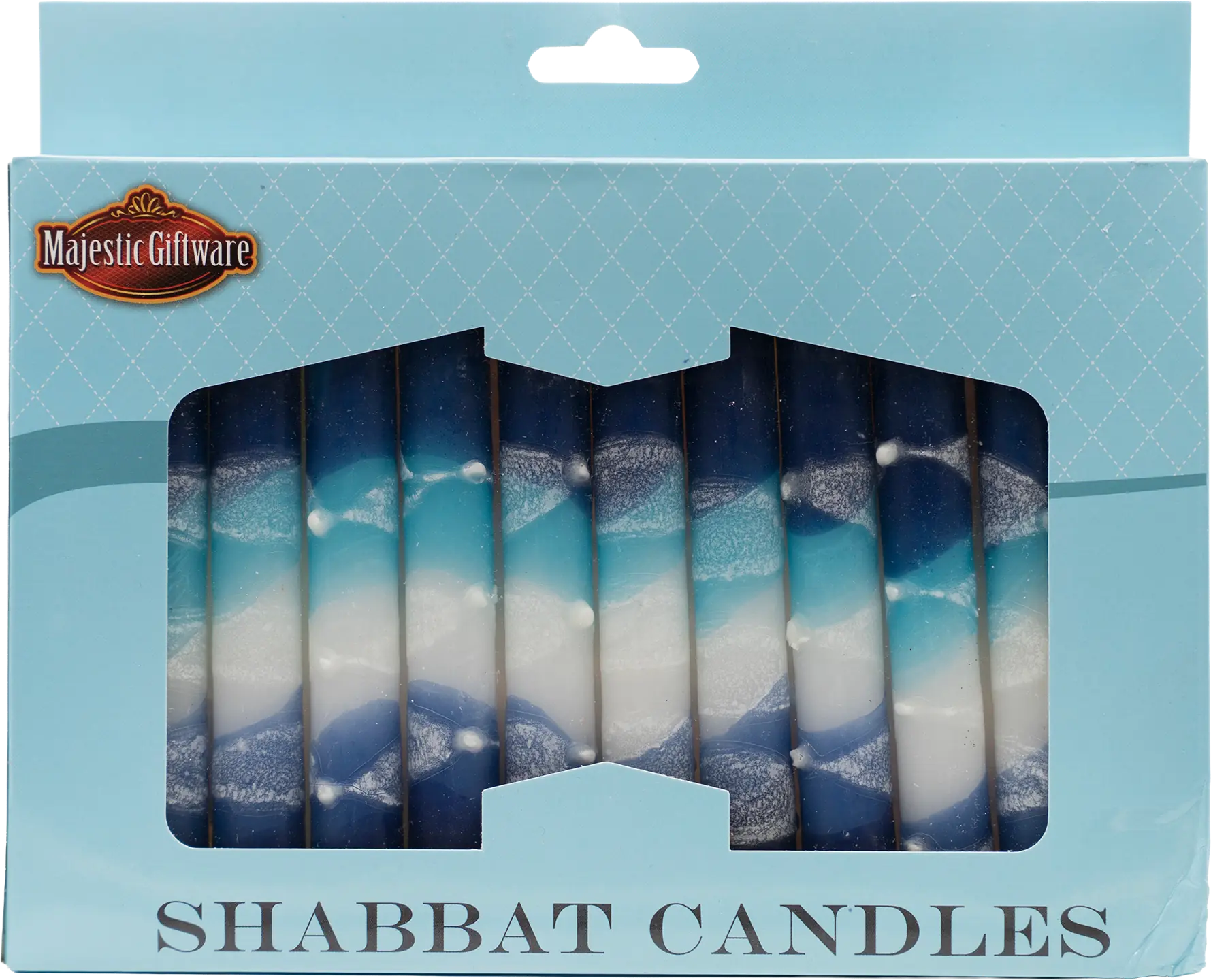 Lovely shabbat candles featuring the 3 colors of Navy, Turquoise and White on top and bottom of the candles.